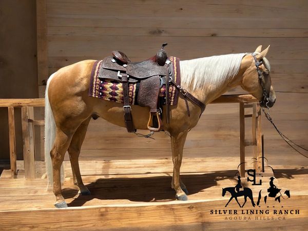 Harley is a barn favorite. Athletic, trail savvy and full of potential. This big, intelligent gelding gets lots of attention with his beautiful coloring and quality movement. He has the moves to be a Ranch Rider, Western Dressage or Equitation horse with his really nice ground covering stride and uphill canter. He will track a cow, work a flag, crosses water, bridges, open gates off him, street rides and handles rough terrain with ease.